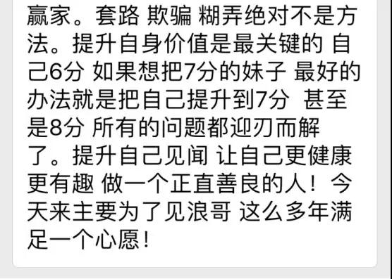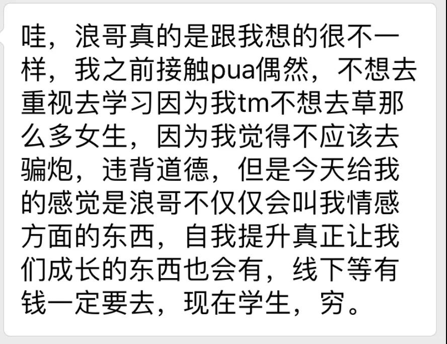 有盆友说我顽强,说我短短一个月,碰到那么多事情,从人间天堂,到炼狱。 到如今竟然又挺了回来,换做别人早崩了。 自己听见这一话的情况下,挺惊讶,由于针对我而言,我只是是在过我的生活。 我很喜欢这一制造行业,觉得能够帮上许多的男士,我见到她们如同见到我的以前。 从前的我尽管我不会比他人差还比他人更勤奋,可是我依然在工作和情感的道上徘徊不前,茫然,无奈。 上星期我要去去上海开分享会,有一位兄弟花了2000报考VIP跟我用餐。 原本人们哪个晚饭等于一个私秘的本人感情讨论会,結果他在用餐的情况下一个难题也不谈。 我也很好奇心,我讲兄弟你也问点感情问题啊,要不然这个钱并不是白交了没有。 他笑眯眯的说不需要了浪哥,我在2019年四月你回家后刚开始听YY,遭受你的启迪随后干了一份做兼职,到如今一个月大约能做80多万元。 我讲做兼职做80多万元一个月還是非常好了,那么你正职是什么,她说我是个监狱警察,平常类似一个月4、5000吧。 后边我要去到北京市,一下飞机场就会有兄弟的快车在等待人们,北京的几日他开着一辆七系鞍前马后,也一样是报考了VIP跟我用餐,晚餐的情况下也不太說話。